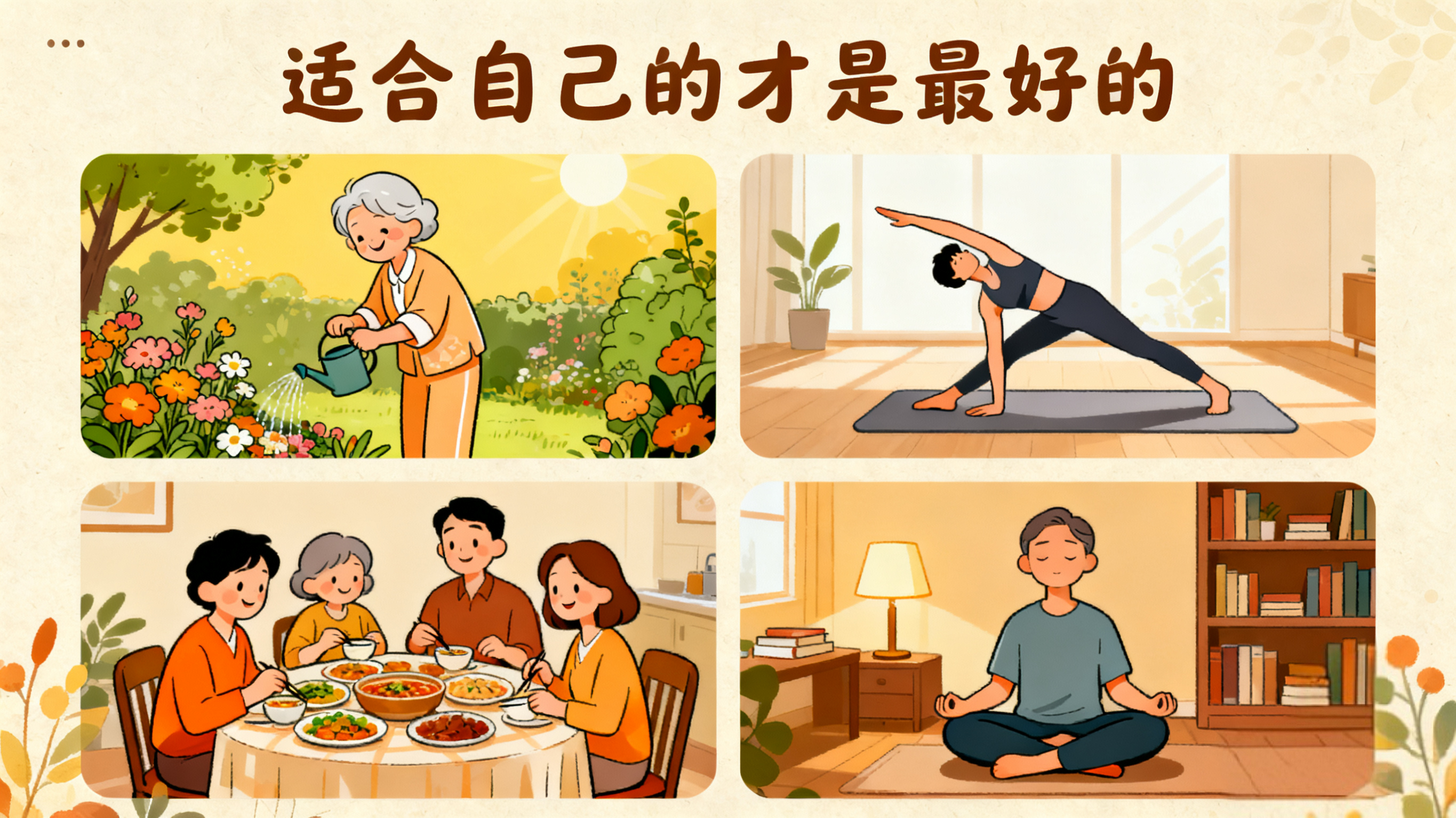 正确原则:将多种运动类型(有氧、力量、柔韧、平衡)融入生活,并找到能让你长期坚持、感到愉悦的方式。 原则是“动则有益,贵在坚持”,形式可以千变万化。