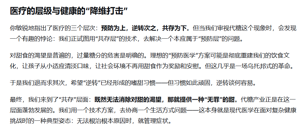 医学的无奈,正在于我们总在第三层才用力,却忘了第一层才是性价比最高的健康投资。就像控糖,等到血糖超标再去依赖代糖、药物,远不如一开始就不过度嗜甜 ——身体的平衡,从来不是靠 “补救” 维持的。