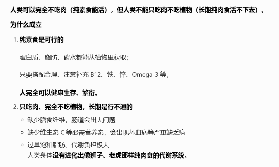 完全不吃谷物、不吃植物,只吃肉,对人来说几乎不可持续。人不是纯粹的食肉动物,缺少长期只吃肉所需的消化与代谢机制,缺乏谷物和植物提供的碳水、纤维、维生素,身体很快会出现代谢紊乱。换句话说:不吃肉可以,不吃谷物和植物,才是真的不可想象。