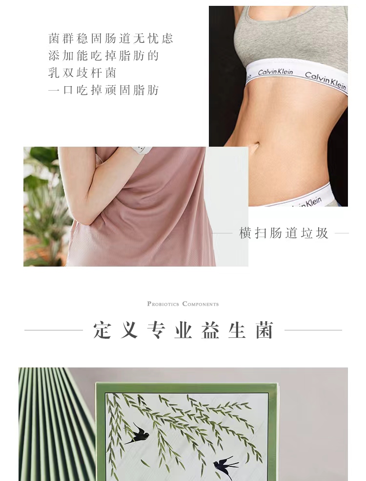 伊惟康益生菌组件精选六大稀有菌种,改善便秘、胀气、口臭、消化不良和不明原因的炎症。每袋含六大菌种和多种优质益生元(膳食纤维),不添加任何糖、代糖、果酱、果汁浓缩等调味剂,每盒15袋,总活菌含量超过2160亿cfu。因腰臀比不合理人群日益年轻化,日常补充有益菌,促进肠道菌群平衡,保持良好代谢,维持健康腰臀比。包装盒设计以浅绿金色为基调,采用杨柳枝、双飞燕的画面,旨在让人们回到“杨柳细腰、身轻如燕”的美好时光,从每天一包伊惟康益生菌开始。