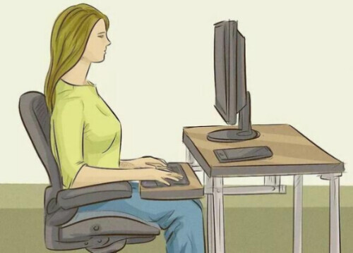 自然端坐,部和背部要充分接触椅面,双肩后展,两肩连线与桌缘平行,脊柱正直,两足着地。将桌椅高度调到与自己身高比例合适的最佳状态,使目光平视电脑屏幕,双肩放松。避免头颈部过度前屈或过度后仰,以减轻长时间端坐引起的颈部疲劳。