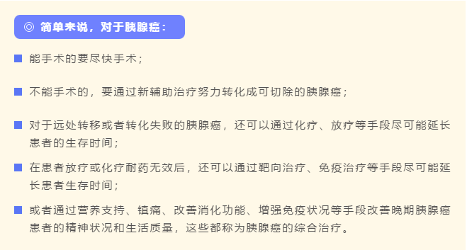 手术是胰腺癌唯一可能治愈的手段,但除了手术,胰腺癌还可以有放疗、化疗、靶向治疗、免疫治疗、支持治疗等多种手段。