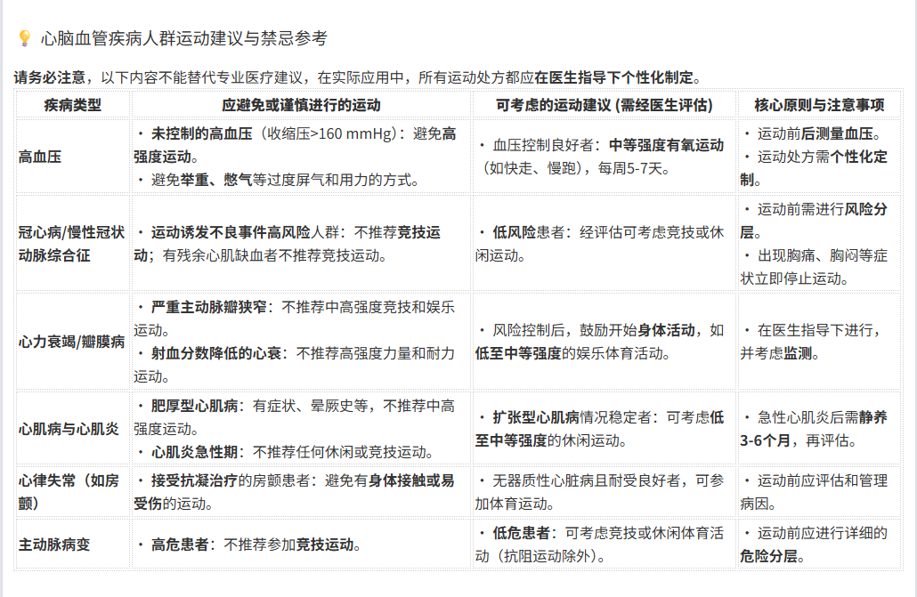 运动有益健康,但是有些疾病存在明确不适宜的一些运动锻炼的也是很明显的、要注意的。生活中很多人把耐力运动,强抗阻运动作为日常健身保健运动,可能还是欠妥的吧?动不动就跑个全马或半马作为锻炼的常态?不知道是为了健康还是为了发朋友圈?当然健康人群的爱好无可厚非,但是当你已经发现有一些和血管健康相关的症状之后就该谨慎接触这些运动锻炼了,又不是只有这些才能保健的?动则有益健康,是包含所有运动类型的,但不是要指定你必须去做某类运动的(康复患者除外)。运动锻炼主要考虑的是综合运动健康收益,而不像竞技类运动,考虑的是某一项运动的收益,如此而已。