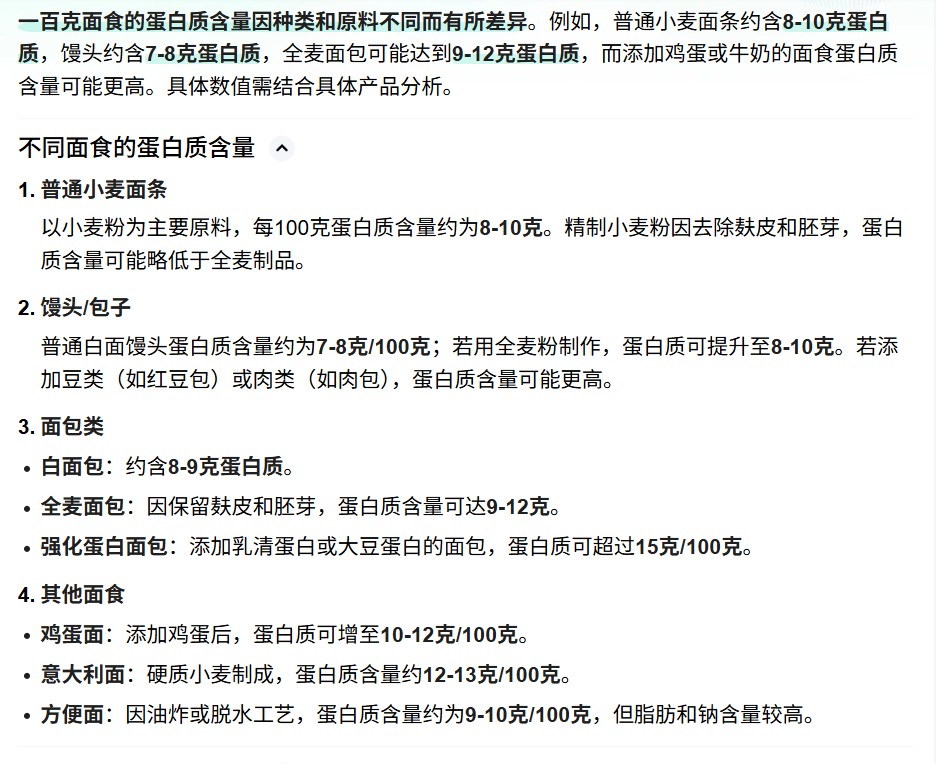 蛋白质 (克) | 7.9 | 11.2 | 7.3 | 面食蛋白质含量依然最高,糯米的蛋白质含量最低。 |