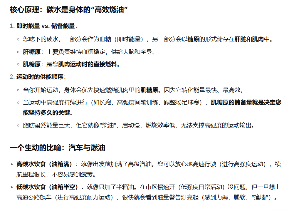 在保证血糖不超标的前提下,增加碳水摄入 ↔ 提高肌糖原储备 ↔ 直接增强体力与耐力续航。