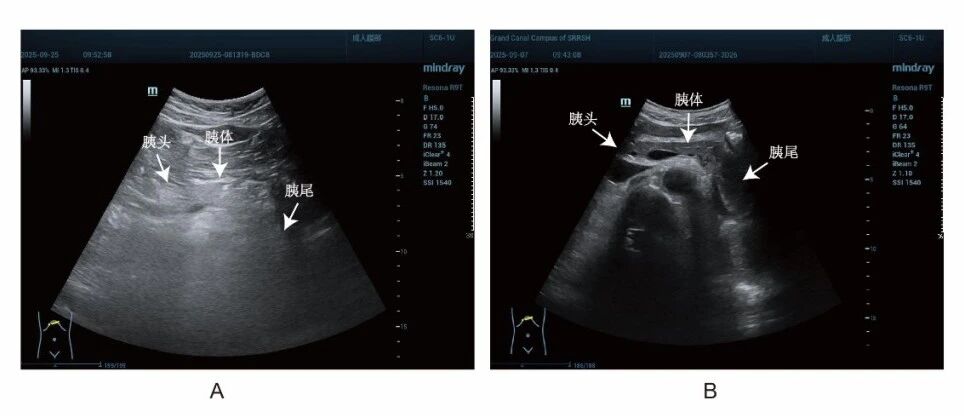(白色箭头所指分别为“胰头”“胰体”“胰尾”,A:因胃肠道气体干扰,胰尾显示不清,B:胰腺各部分显示清晰)