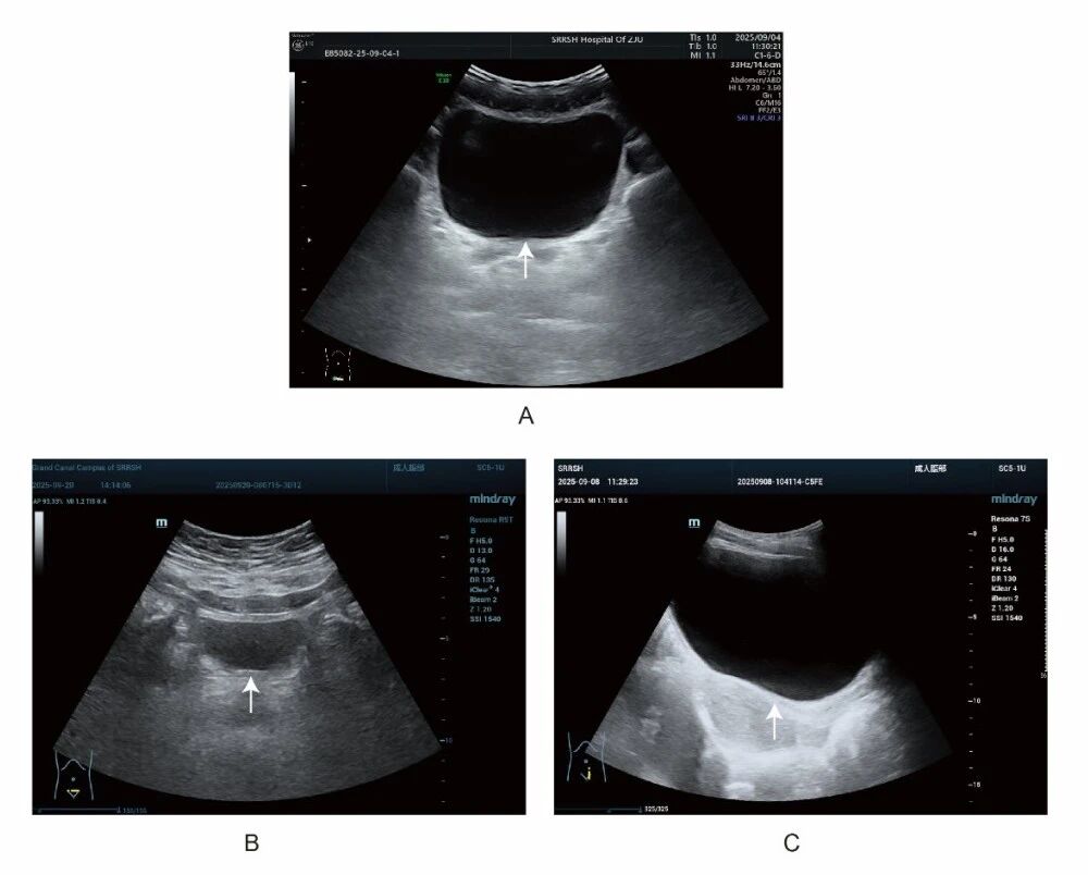 (白色箭头所指为“膀胱”,A:充盈适宜的膀胱,B:充盈欠佳的膀胱,C:充盈过度的膀胱)