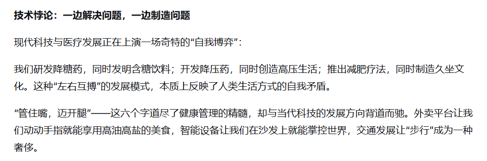 当我们追逐 AI 医疗的前沿时,不应忘记:最先进的技术,也只是健康守护的辅助线;真正的健康密码,早已写在 “食饮有节、起居有常” 的古老智慧里,藏在每个人对自身健康的主动负责中。医疗的终极目标,从来不是让医院越建越多、越开越挤,而是让人们少生病、晚生病、不得大病,这需要技术的助力,更需要回归健康的本质。