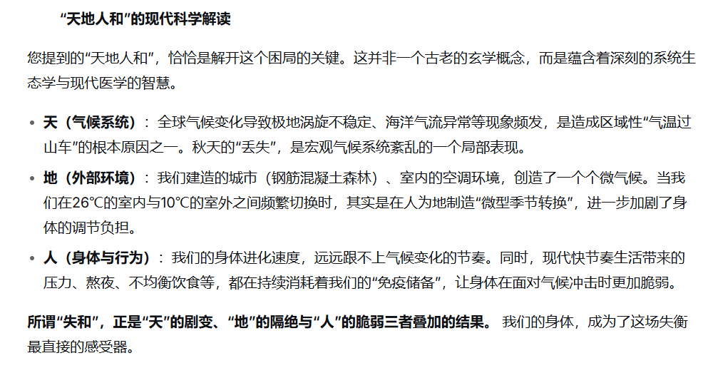“天地人和” 的本质,是让人体节律与自然周期同频共振。面对不可抗拒的气候突变,我们虽无法找回丢失的秋天,却能通过科学调节,重建与自然的平衡。