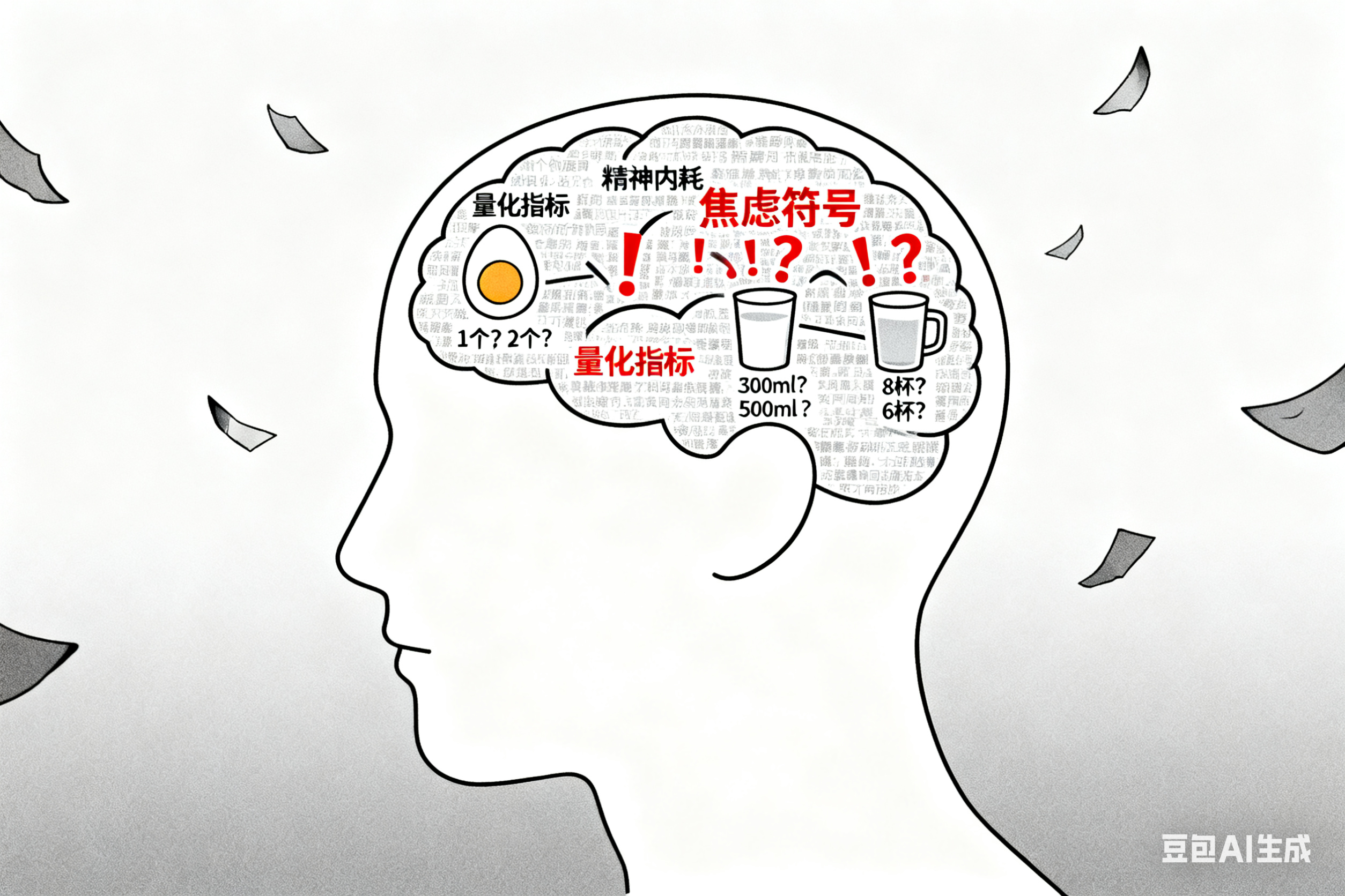 更值得警惕的是,这种 “碎片化科普” 正在制造一种 “健康功利主义”:我们把健康当成一项 “必须精准达标的任务”,把吃饭变成一种 “需要计算的负担”,反而违背了 “饮食养生” 的初衷。就像有的人每天严格计算饮水量,却因为纠结 “喝白开水还是喝茶” 而焦虑失眠;有的人执着于 “每天 1 杯牛奶”,却忽略了自己乳糖不耐受的体质,最后反而伤了肠胃。心理学里有个 “过度自我关注” 的概念,当我们把注意力过度集中在这些细节上,反而会放大身体的细微感受,陷入 “越关注越敏感,越敏感越焦虑” 的恶性循环 —— 这种精神内耗,对健康的伤害,远比 “多吃 1 个鸡蛋” 的影响更大。