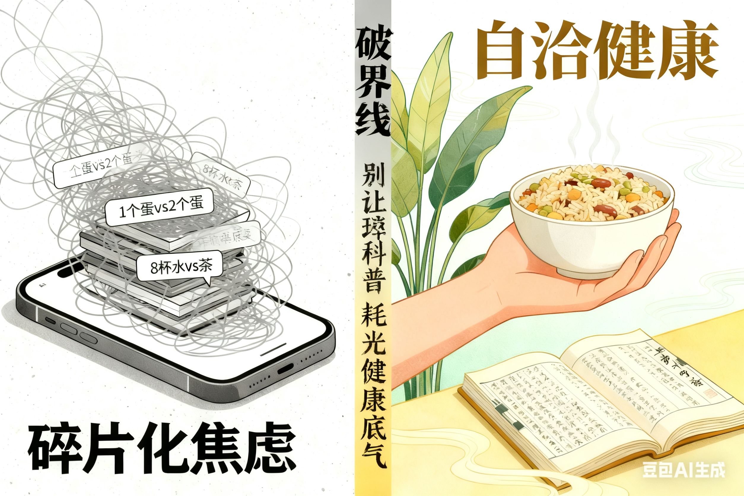 清晨打开手机,“每天 1 个蛋还是 2 个蛋更养心” 的推送弹出来;午间刷朋友圈,“喝牛奶补钙不如喝豆浆” 的文章又占了半屏;睡前刷短视频,“每天 8 杯水是陷阱,喝茶才是养生真谛” 的观点再一次颠覆认知 —— 我们好像活在一个被 “碎片化健康答案” 包围的时代,每天在各种 “标准答案” 里反复纠结,最后不仅没养出健康,反而添了一肚子焦虑。