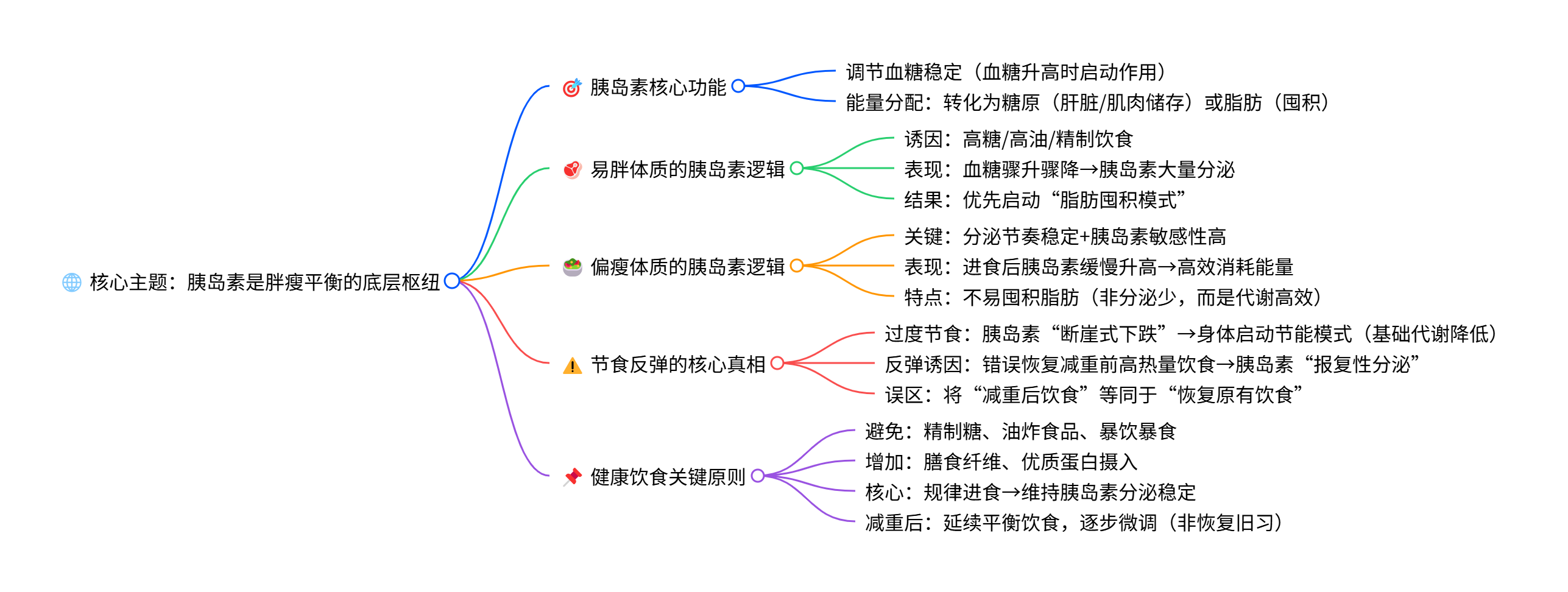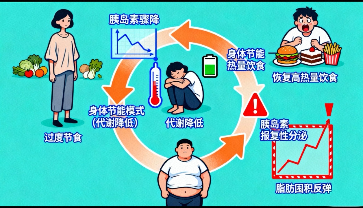 对于易胖体质的人来说(到底是易胖体质还是易胖饮食生活习惯?),高糖、高油的精制饮食是胰岛素的 “兴奋剂”—— 这类食物会让血糖像坐过山车般骤升骤降,刺激胰岛素大量分泌。此时身体会进入 “脂肪囤积模式”,哪怕摄入的热量不算极高,也会优先把能量转化为脂肪储存;而过度节食则走向另一个极端:热量摄入骤减导致血糖持续偏低,胰岛素分泌随之 “断崖式下跌”,身体误以为遭遇饥荒,会启动 “节能模式”—— 基础代谢率降低,能量消耗减少,一旦恢复饮食(尤其是错误地回到减重前的高热量饮食),胰岛素会立刻 “报复性分泌”,把错过的脂肪加倍补回来,这就是 “节食 - 反弹” 循环的核心真相。