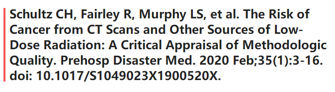 作者认为,具有高质量方法的文章明显占优势,发现低剂量辐射不会增加癌症风险。证据表明,暴露于多次CT扫描和低剂量辐射的其他来源,累积剂量高达100 mSv(大约10次扫描),并且可能高达200mSv(约20次扫描),不会增加癌症风险。