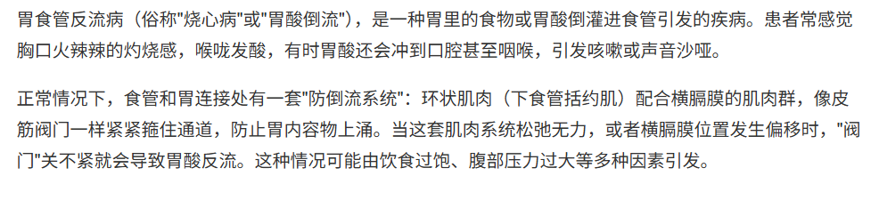 虽然偶有反流到嗓子眼的酸水难受感,甚至有时半夜被呛咳惊醒的现象,但都没有当作一种严重的现象,只是知道自己吃多了是原因,而过后明天、下一次就忘记了,该多吃还是多吃了。
