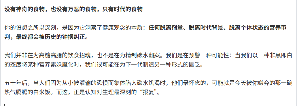✅拒绝极端化:健康管理需警惕 “非黑即白” 的二元对立思维,强调个体差异与长期平衡,尊重碳水作为大脑核心能量的刚需属性。