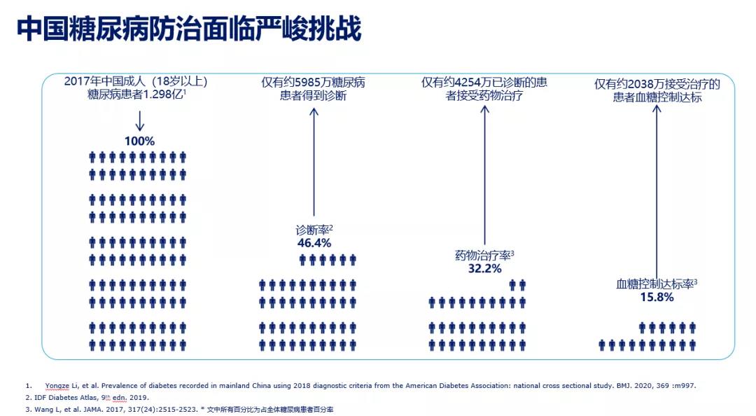 2020年《英国医学杂志》上刊登的中国人群糖尿病患病率的最新全国流行病学调查数据显示,我国预计糖尿病患者总人数已超过1.29亿①,数量位居全球第一。