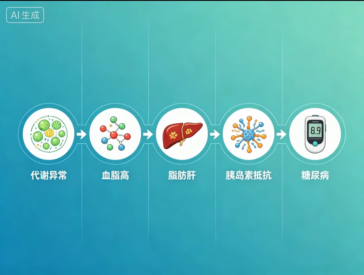看到一篇在讲糖尿病形成的健康科普,觉得讲的挺细致的,流程也挺符合的,代谢异常☞血脂高☞脂肪肝☞胰岛素抵抗☞糖尿病☞并发症...