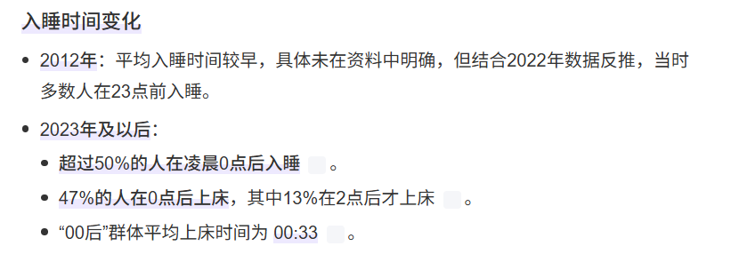 这里有组数据值得思考:中国居民平均睡眠时间从2012年的8.5小时下降到2023年的不足7小时,凌晨12点后入睡的比例超过50%。大量研究证实,长期睡眠不足与高血压、糖尿病、肥胖、抑郁、免疫功能下降的关联强度,绝不亚于食品安全带来的风险。