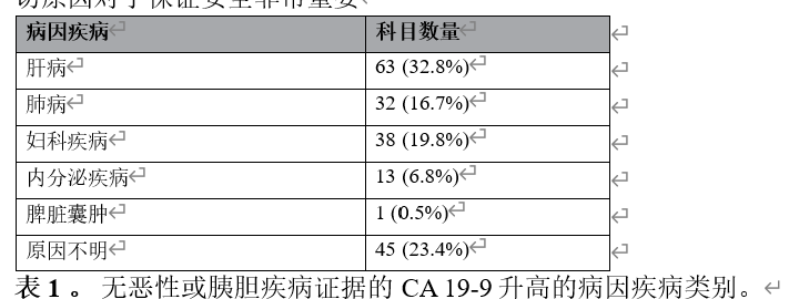 本研究表明良性疾病最常引起CA199升高,以及每种疾病中CA199水平升高的范围。
