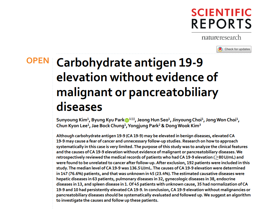 对于CA199升高目前没有一个规范的指南或者专家共识来告知临床医生应该怎么办,绝大多数医生依靠的都是自己的临床经验,为此我特意去找了一篇文献,这篇文献发表在NATURE子刊上,可信度比较高。
