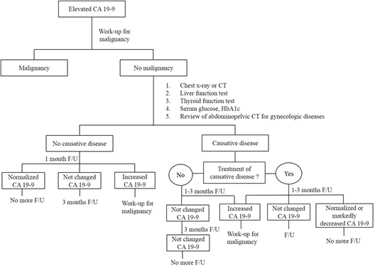 因此,当即使在系统筛查后也不知道CA199升高的原因时,这些患者应在1个月后进行随访研究。如果CA199持续升高或者无变化,建议3个月后再次检查CA199。如果CA199水平显著降低或正常化,即使没有解释升高的确切原因,也不需要定期复查CA199。如果CA199持续增加,需要进一步完善所有检查,排除恶性肿瘤。
