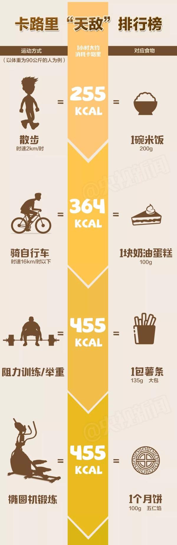 今天,小编为你准备了一份卡路里“天敌”排行榜,把各类运动消耗的卡路里换算成了各种熟悉的食物。对照图片快来计算一下吧!