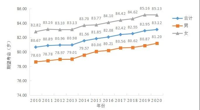 近日,我市2020年户籍人口期望寿命新鲜出炉——2020年杭州市户籍人口期望寿命83.12岁,较2010年的80.67岁上升了2.45岁,达到世界发达国家和地区领先水平。其中,男性为81.20岁,女性为85.13岁。