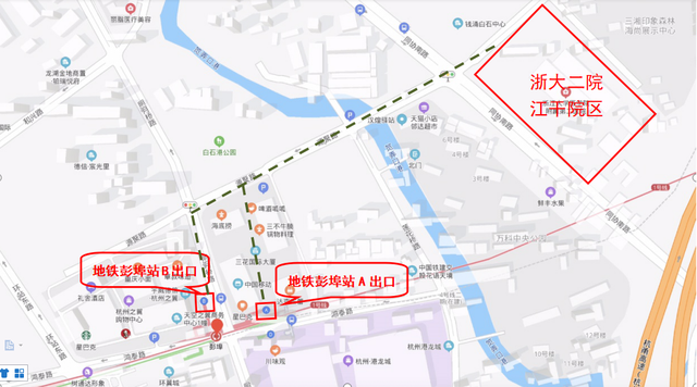 地铁1号线、4号线彭埠站A/B出口步行700米。步行线路示意图: