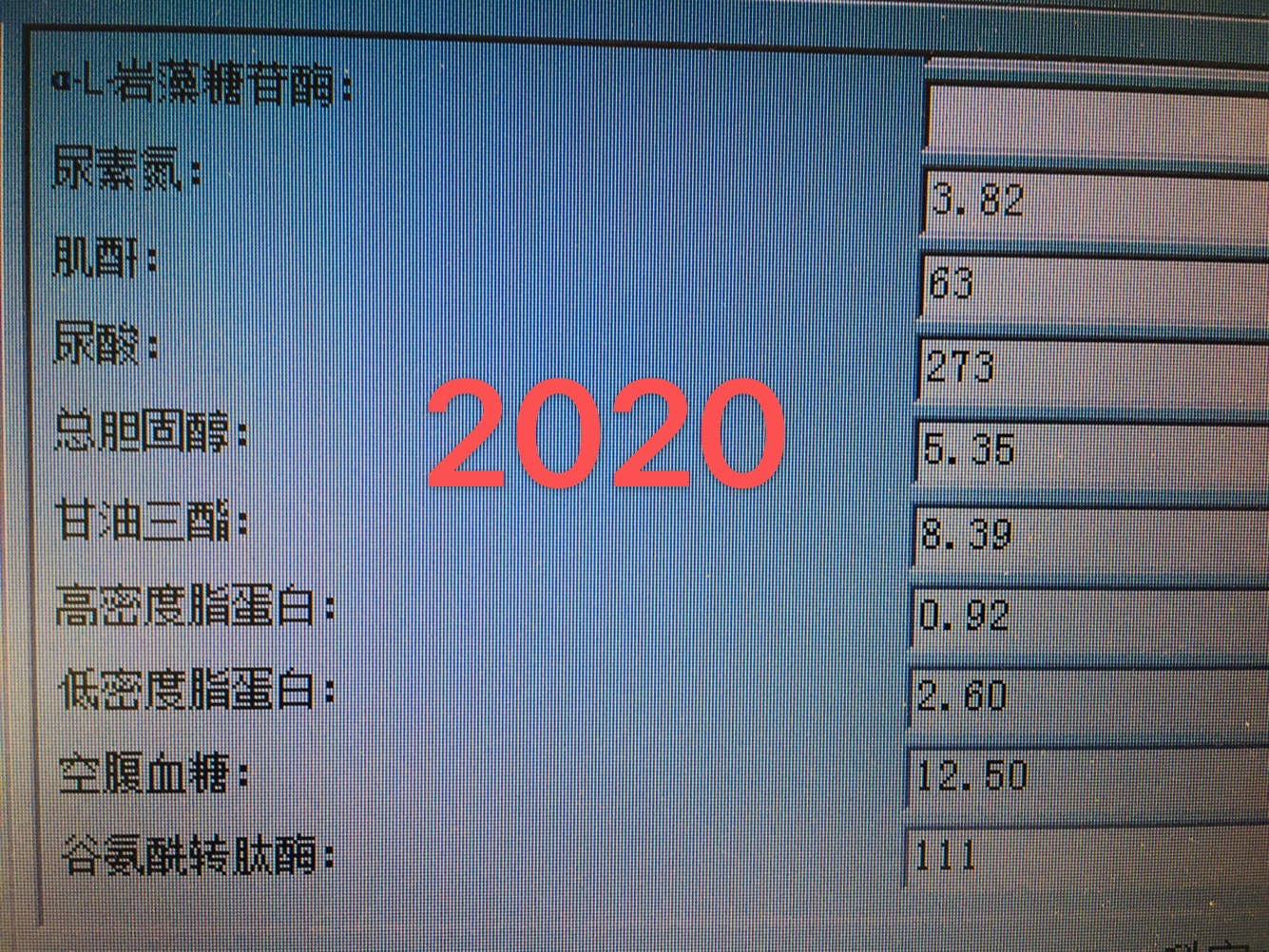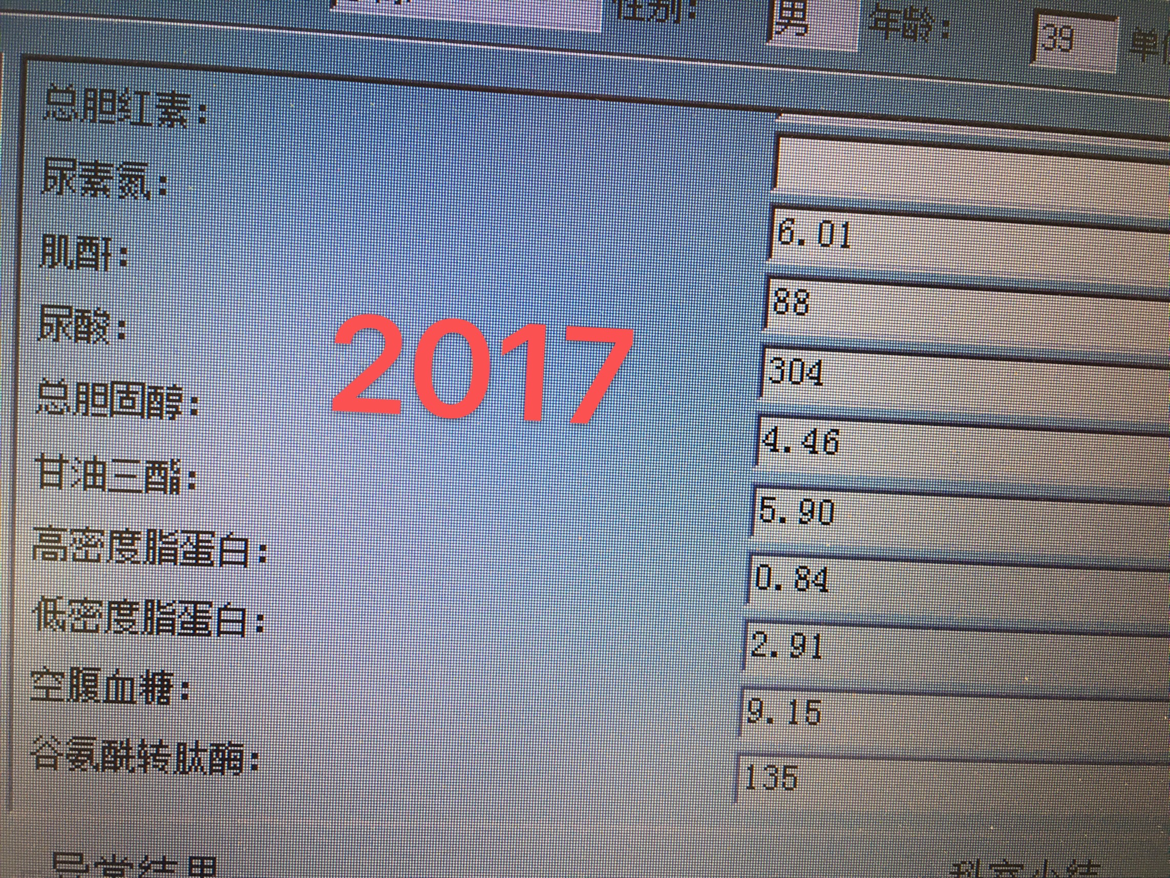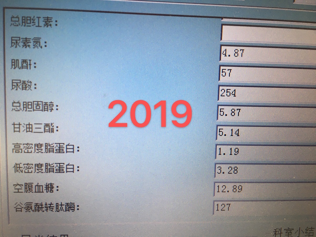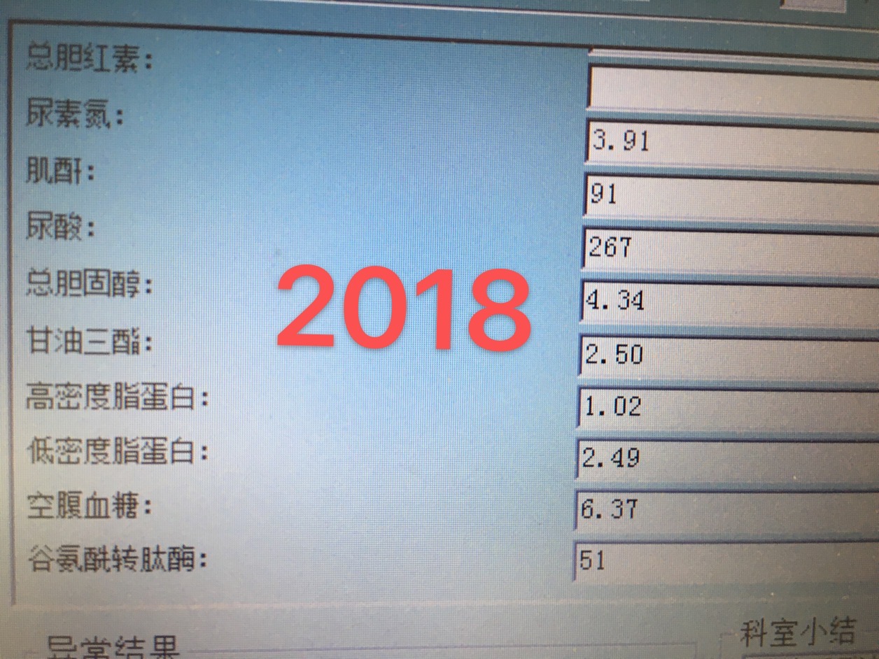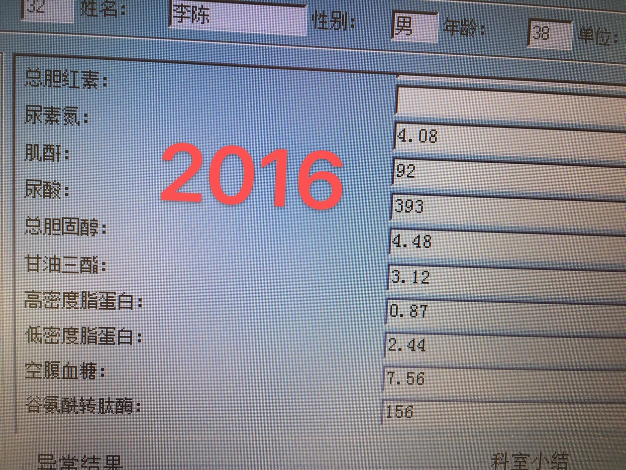 这是2016年的生化检查:总胆固醇:4.48mmol/L;甘油三酯;3.12mmol/L;空腹血糖7.56mmol/L;低密度脂蛋白2.44mmol/L;甘油三酯和空腹血糖两项指标继续升高,还是没有重视。