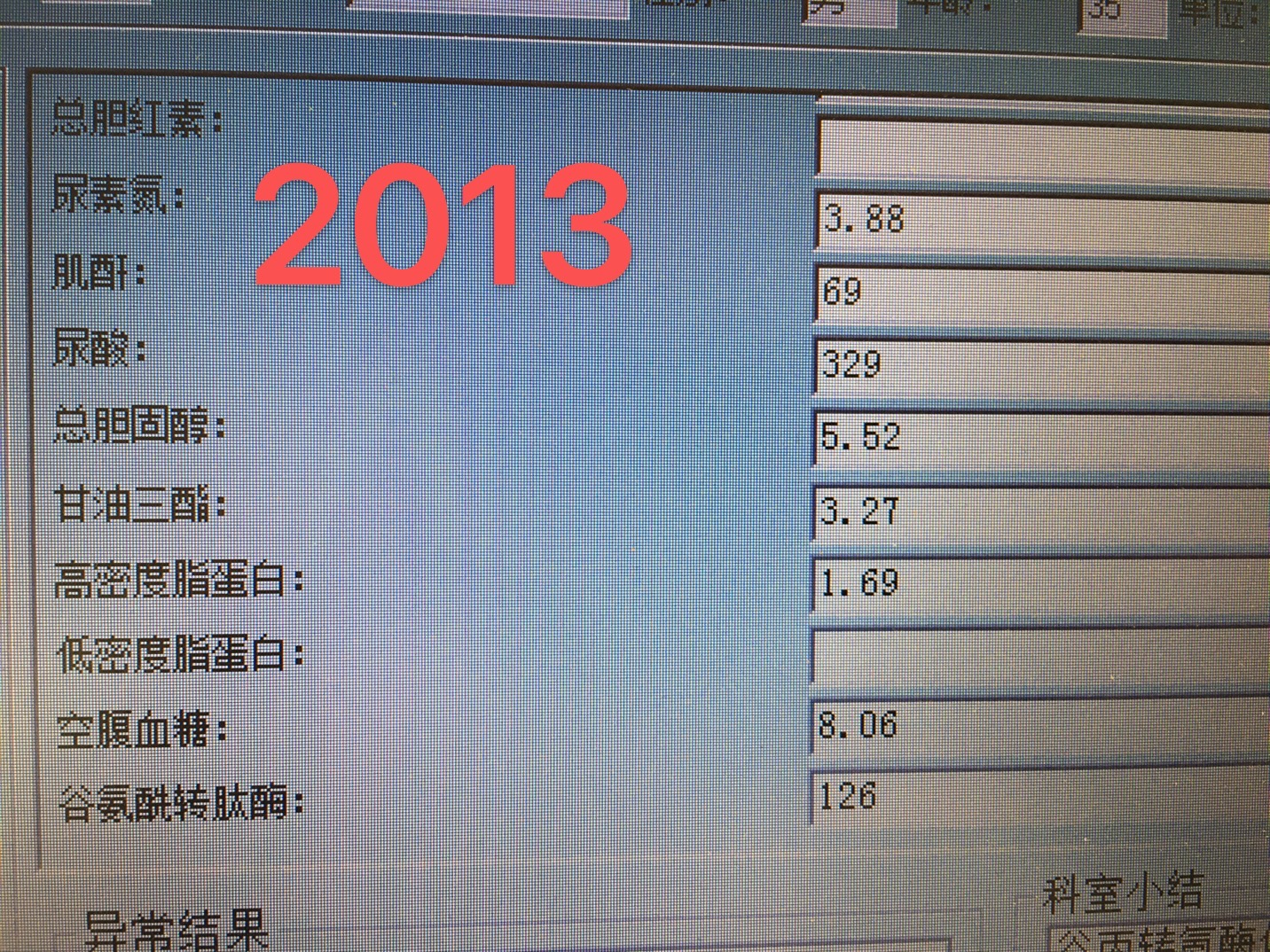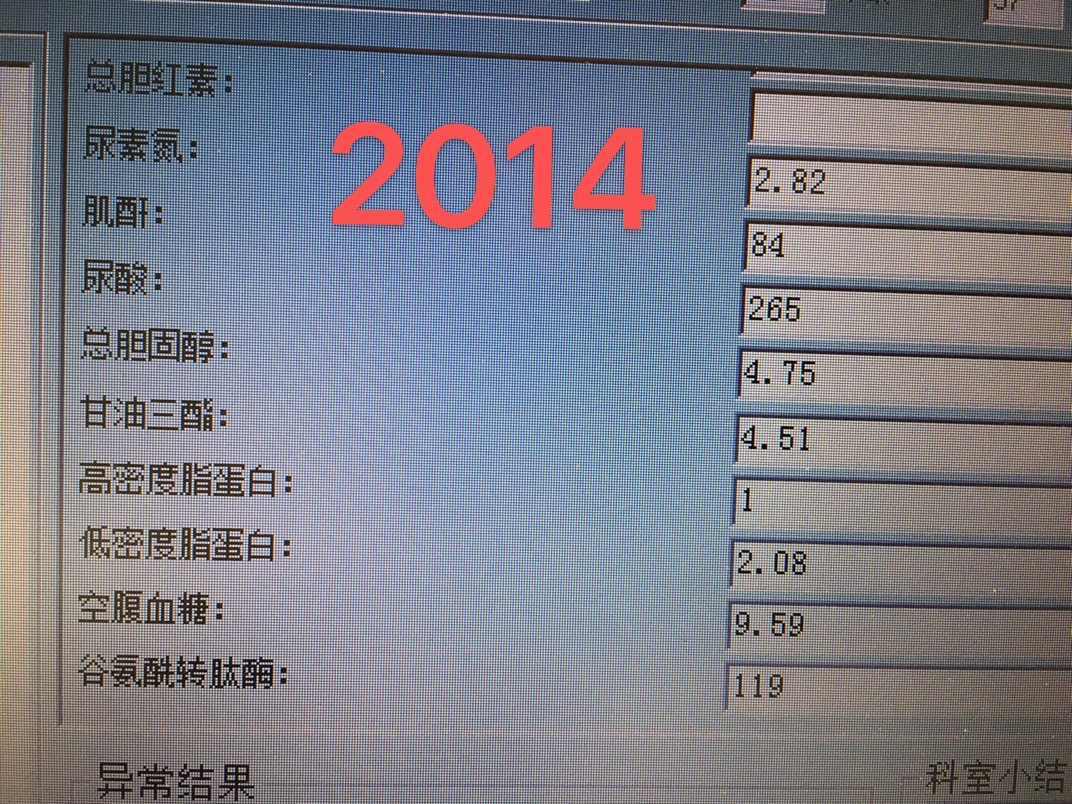 这是2014年的生化检查:总胆固醇:4.75mmol/L;甘油三酯;4.51mmol/L;空腹血糖9.59mmol/L;低密度脂蛋白2.08mmol/L;;甘油三酯和空腹血糖继续升高,也从未处理,也未重视。
