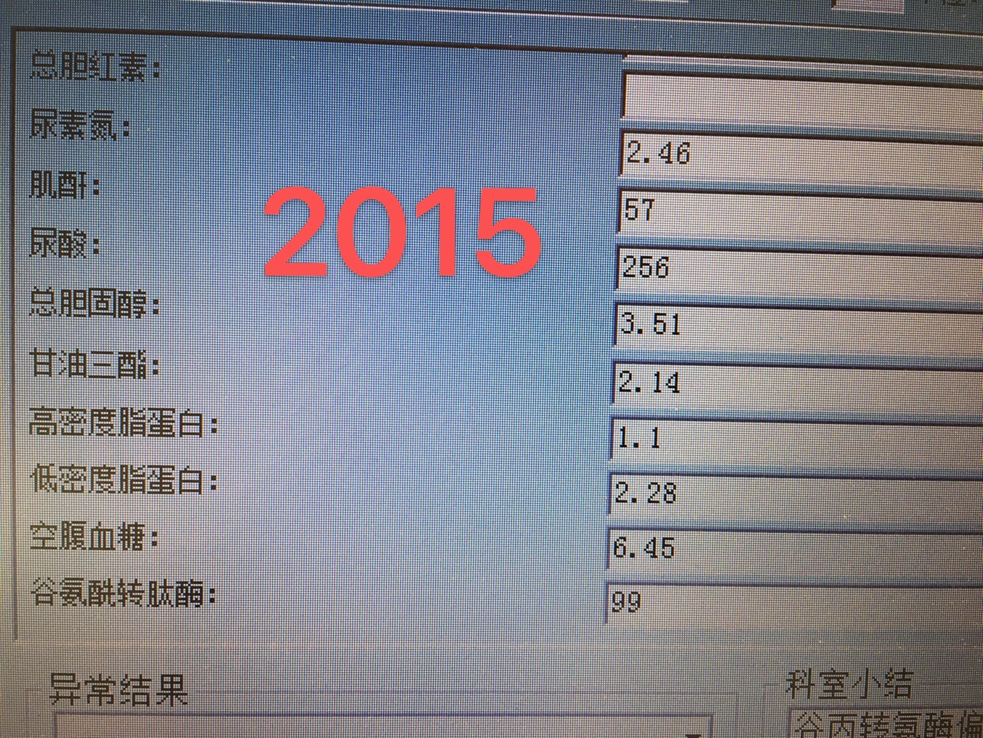 这是2015年的生化检查:总胆固醇:3.51mmol/L;甘油三酯;2.14mmol/L;空腹血糖6.45mmol/L;低密度脂蛋白2.28mmol/L;比14年数值有所降低,但平时除体检之外,没有检测过血糖和血脂。