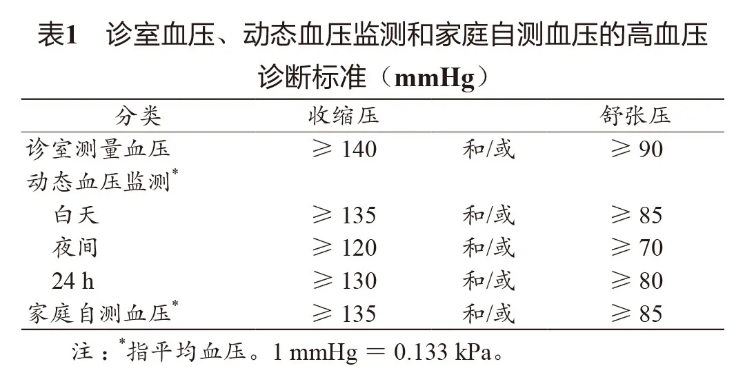 (2)诊断不确定,或怀疑“白大衣高血压”或“隐蔽性高血压”,有条件的可结合动态血压监测或家庭自测血压辅助诊断;无条件的建议转诊。诊室血压、动态血压监测和家庭自测血压诊断高血压的标准见表1。注意家庭自测血压用于辅助诊断时应谨慎,确保使用经认证的上臂式电子血压计,且符合操作要求。