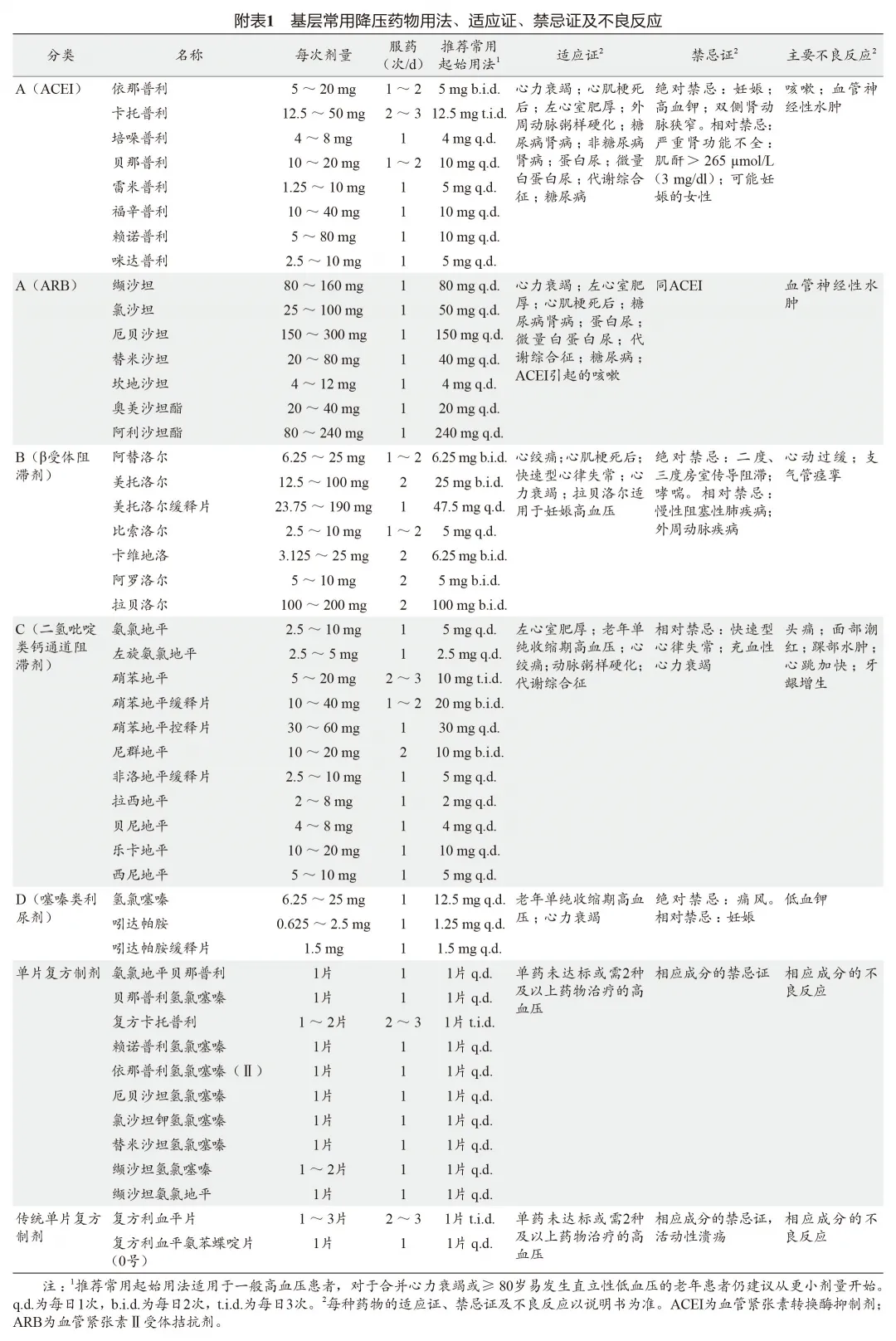 5.4.3 药物治疗方案 根据患者是否存在合并症及血压水平,选择合适的药物,优选长效药物。除心力衰竭及直立性低血压风险较大的高龄初始用药患者建议从小剂量开始外,其他高血压患者可从常用起始剂量开始,具体参见附表1。