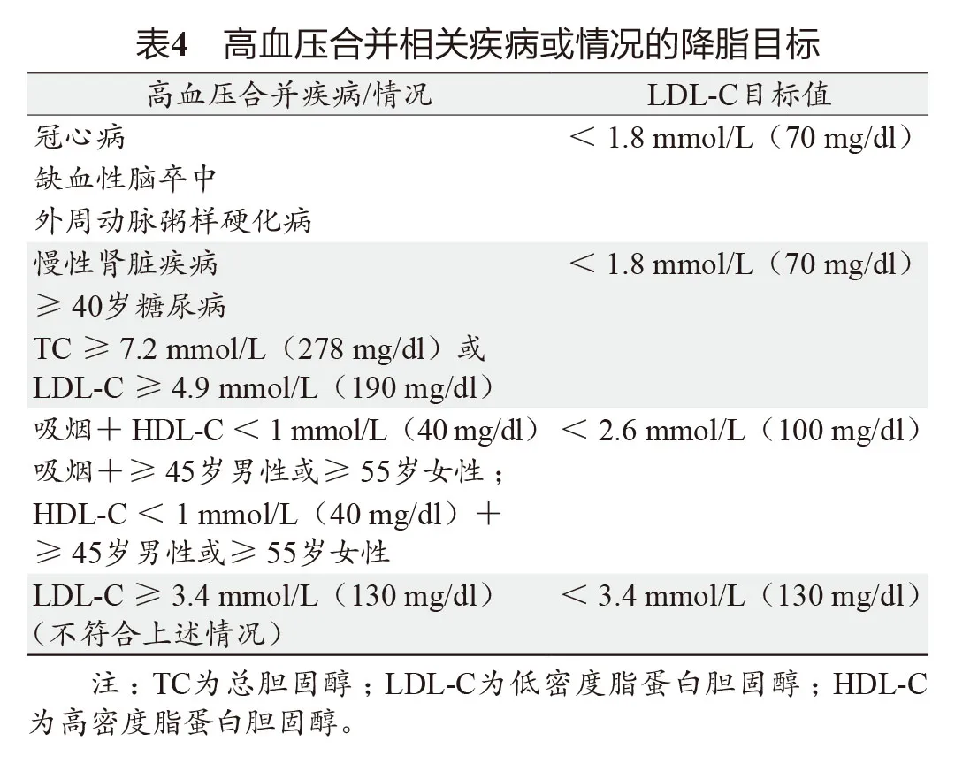 不符合上述情况,但LDL-C≥3.4 mmol/L(130 mg/dl)的高血压患者,建议LDL-C降至3.4 mmol/L(130 mg/dl)以下。高血压合并相关疾病或情况的降脂目标见表4。