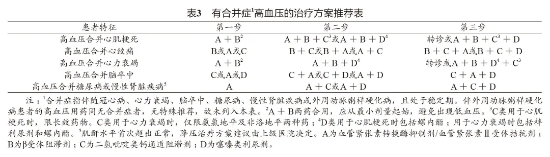 合并外周动脉粥样硬化病:初始选择C、A、D或B均可,单药未达标可联合用药,同“无合并症高血压药物治疗方案”。但慎用非选择性β受体阻滞剂如普萘洛尔。