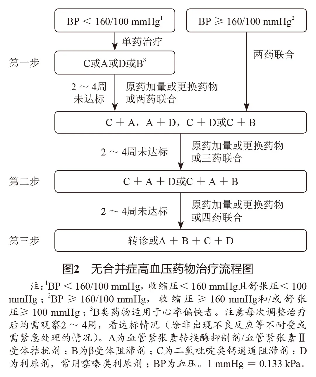 (1)无合并症(合并症:指伴随冠心病、心力衰竭、脑卒中、糖尿病、慢性肾脏疾病或外周动脉粥样硬化病)高血压药物治疗方案见图2。