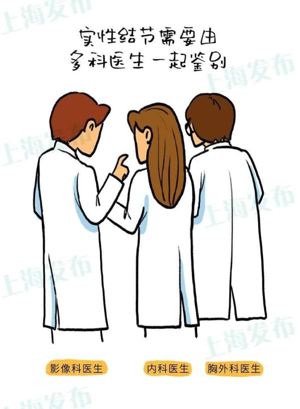 实性结节需要由影像科医生、内科医生、胸外科组成的团队来一起鉴别:在CT上,恶性实性结节一般有分叶、短毛刺、胸膜牵拉、血管集束、空泡征等。