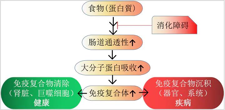 虽然吞噬细胞与肾脏的滤过可以将部分免疫复合物代谢出体外,但是过量的免疫复合物可能超过机体的清除能力,在这种情况下如果不能及时改变饮食结构,体内的免疫复合物可以介导产生各种临床症状和疾病表现[1,2](如图1所示)。