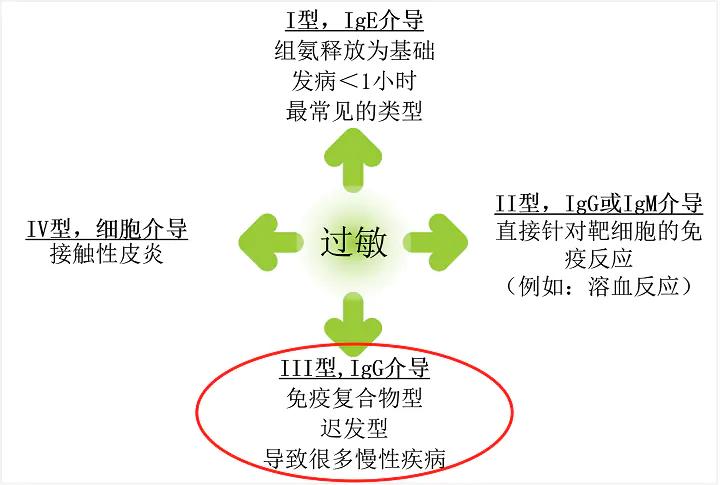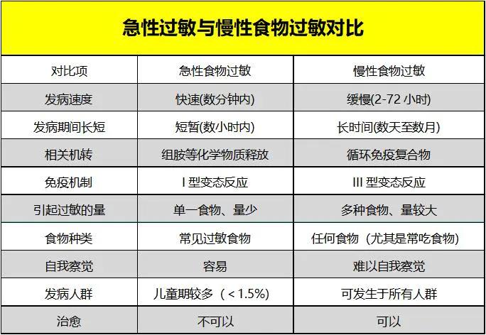 慢性食物过敏(IgG)不同于急性过敏(IgE)。急性过敏反应主要由免疫球蛋白E主导,通常在接触过敏原后的2个小时内即产生反应。