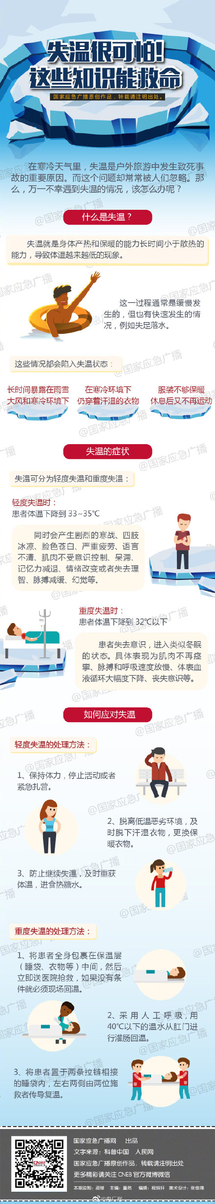 在寒冷天气,失温是户外旅游、运动中发生致死事故的重要原因。轻度失温,会出现四肢冰凉、肌肉不受控制等情况,甚至产生幻觉;重度失温,患者会失去意识。