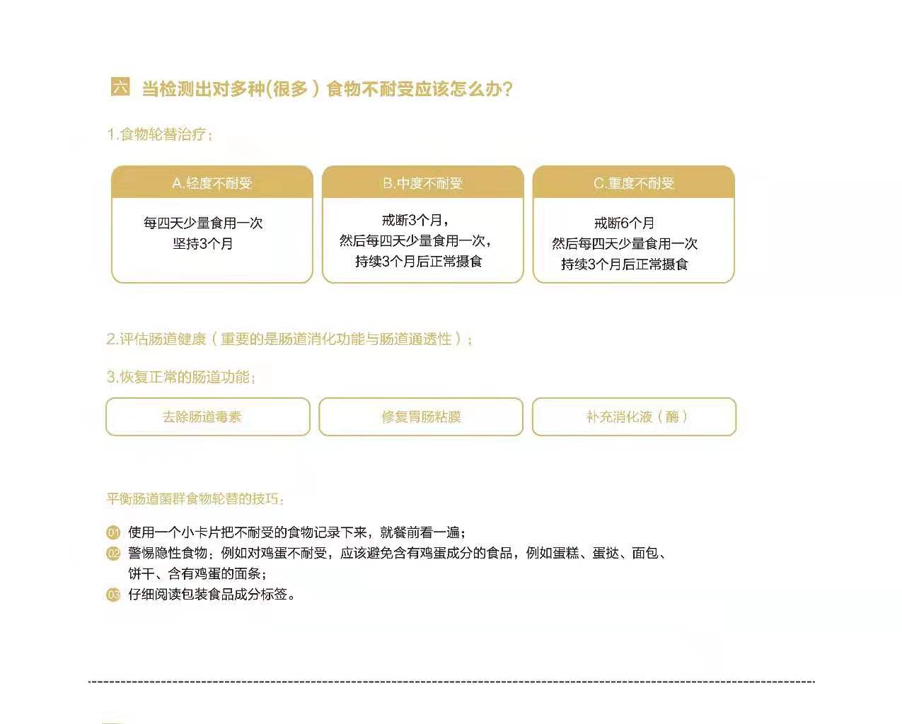 正常情况下,食物特异性lgG抗体在血清中的半衰期约为20-23天,经过3个月(约4个半衰期)后体内食物特异性lgG抗体水平大幅度减少,随着抗体减少免疫反应逐渐减轻,症状随之减轻或消失。因此食物轮替以3个月为一个周期,中度不耐受食物戒断3个月,由于重度不耐受“抗原-抗体复合物”的量较大,所以建议戒断6个月。