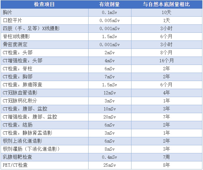 如1次胸片检查,平均有效剂量是0.1mSv,相当于10天的自然本底辐射剂量(生活环境中存在的天然射线的照射)。