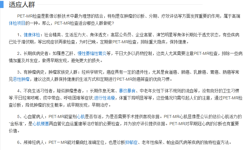 PET-MR一次检查便可发现全身是否存在危险的微小病灶。早期诊断可以使患者能真正地得到早期治疗并为彻底治愈创造了条件,在国外,PET被视为健康体检的最佳手段之一,定期的PET-MR健康检查可发现一些无症状的早期患者。一般每年做一次PET-MR检查比较合适。PET-MR检查与其他手段相比,它的灵敏度高、准确性好,对许多疾病尤其是肿瘤和心脑疾病具有早期发现、早期诊断和准确评估的价值。