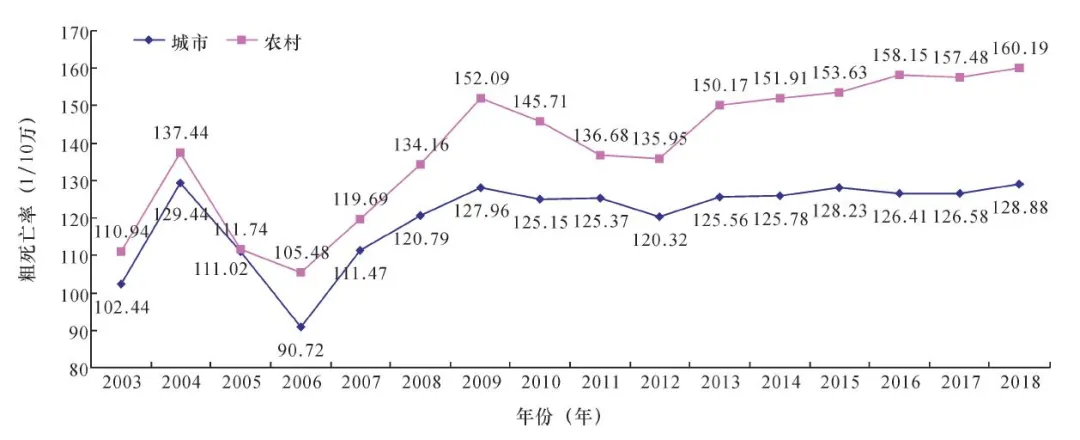 2018年,中国居民脑血管病(粗)死亡率为149.49/10万,占总死亡人数的22.33%,位居死因顺位的第3位。城市居民脑血管病死亡率为128.88/10万,农村为160.19/10万。男性(164.31/10万)高于女性(134.15/10万)。2003—2018年,农村居民脑血管病各年度的粗死亡率均高于城市居民(图6)。