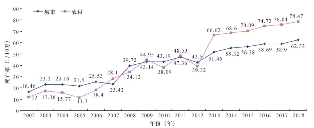 图5 2002—2018年中国城乡地区AMI死亡率变化趋势