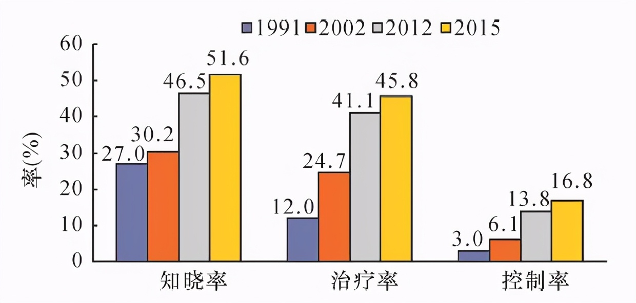 近年,我国居民的高血压知晓率、治疗率和控制率有了明显提高(图2)。