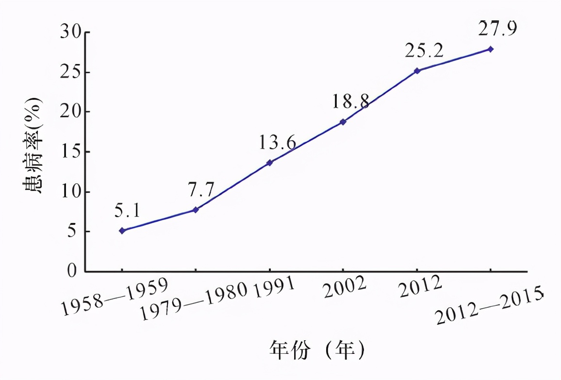 1958—1959年:中国医学科学院重点项目——高血压研究;1979—1980年、1991年:全国高血压抽样调查;2002年:中国健康与营养调查;2012年:中国居民营养与慢性病状况调查;2012—2015年:中国高血压调查;前三项的调查人群≥15岁,后三项的调查人群≥18岁