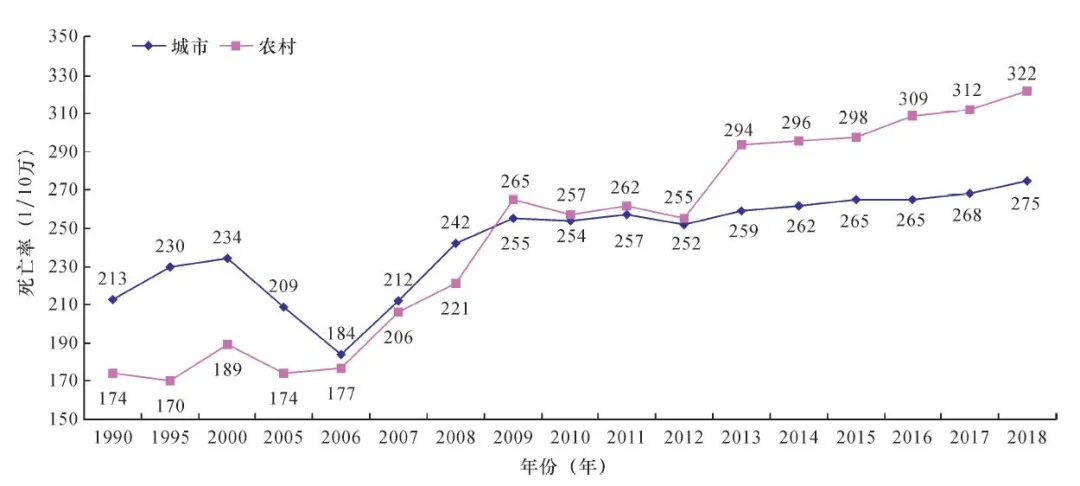 图4 1990—2018年中国城乡居民心血管病死亡率变化