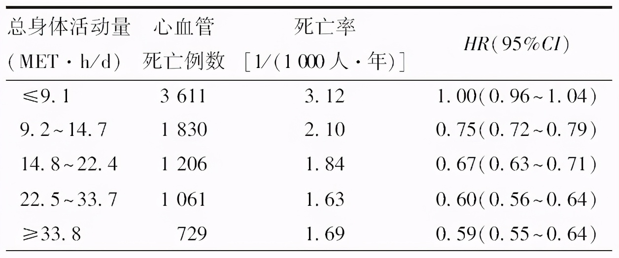 中国慢性病前瞻性研究(CKB)中,48.7万余名基线无心血管病人群平均随访7.5年的结果显示,总身体活动量与心血管死亡呈显著负关联,与活动量最低组(≤9.1 MET·h/d)相比,最高5分位组(≥33.8 MET·h/d)心血管病死亡风险降低41.0%。身体活动每增加4 MET·h/d,风险降低12.0%(表1)。