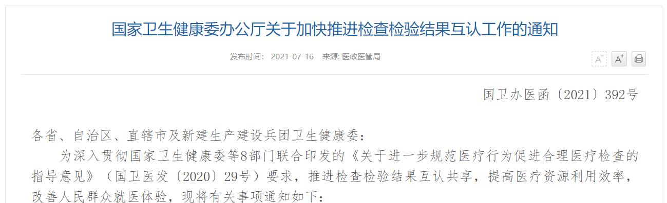 7月16日,国家卫生健康委办公厅关于加快推进检查检验结果互认工作的通知,称检查检验是医疗服务过程中的一项重要环节,开展检查检验结果互认工作可以有效提升医疗机构运行效率,促进医疗资源合理利用,减轻人民群众就医负担,通知还强调,各省级卫生健康行政部门要结合实际情况建立本辖区内的检查检验结果互认体系,明确互认机构范围、条件、诊疗项目(内容)及技术标准等,优先选取稳定性好、高值高频的检查检验项目进行互认。